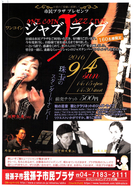 皆様と一緒に、素敵なミュージシャンのジャズナンバーでスウィングしませんか。