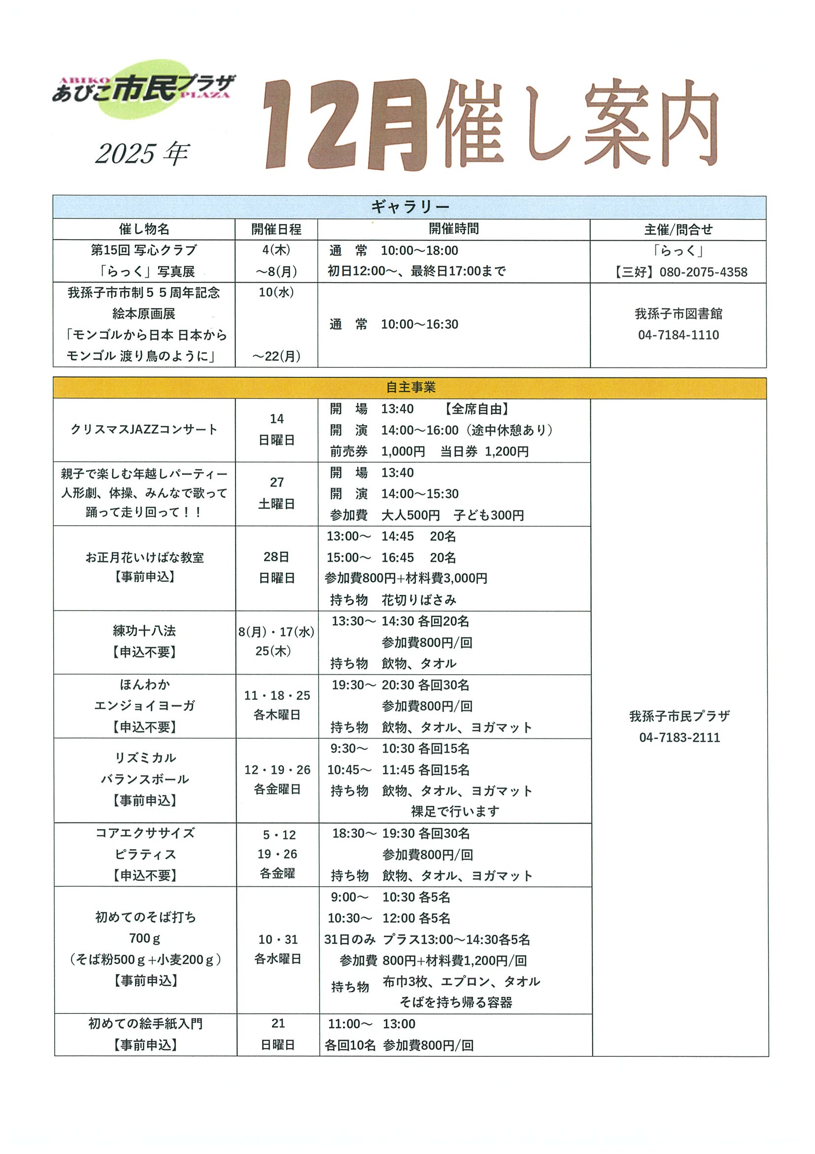 練功十八法・ほんわかエンジョイヨーガ・リズミカルバランスボール・コアエクササイズ・初めてのそば打ち・初めての絵手紙入門も是非ご参加ください。