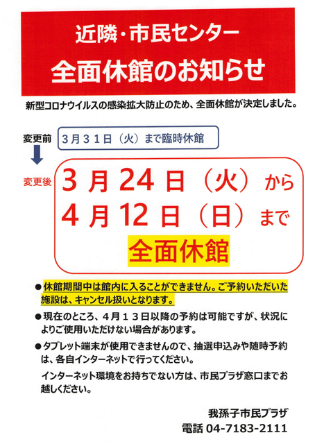 新型コロナウィルスの感染拡大防止のため、全面休館が決定しました。