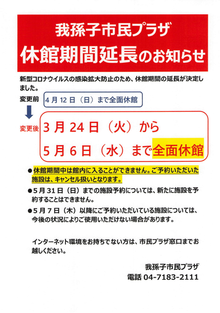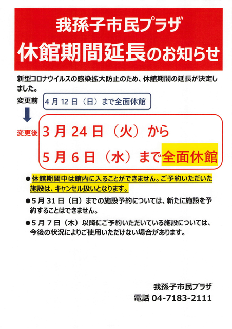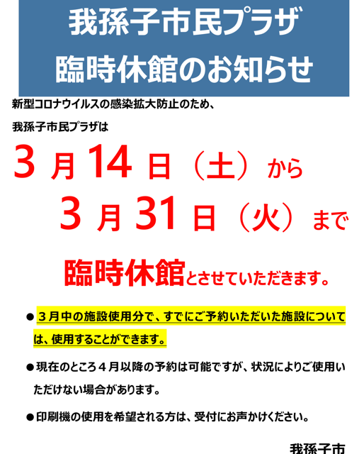 臨時休館とさせていただきます。3月中の施設使用分で、すでにご予約いただいた施設については、使用することができます。