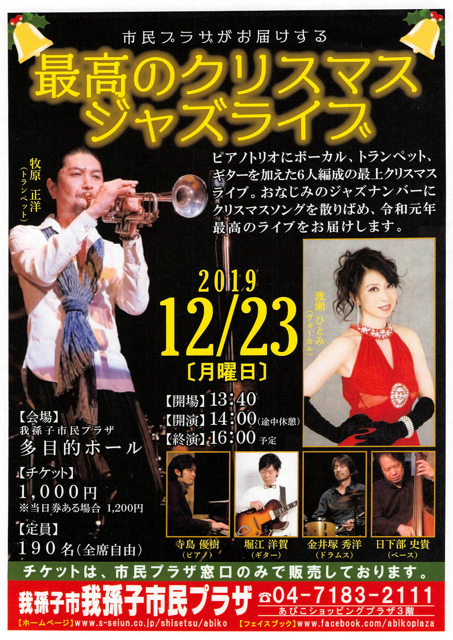 ピアノトリオにボーカル、トランペット、ギターを加えた6人編成の最上クリスマスライブ。おなじみのジャズナンバーにクリスマスソングを散りばめ、令和元年最高のライブをお届けします。