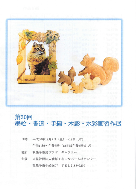 第30回 墨絵・書道・手編・木彫・水彩画習作展が開催されます。