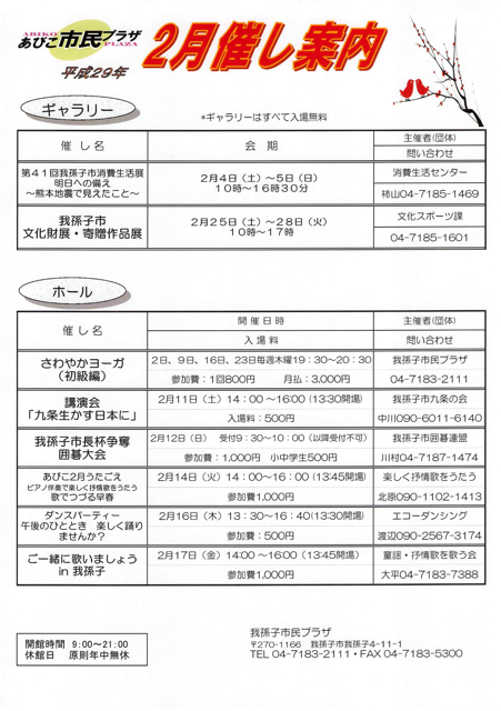 あびこ市民プラザ2月の催し物をご案内いたします。