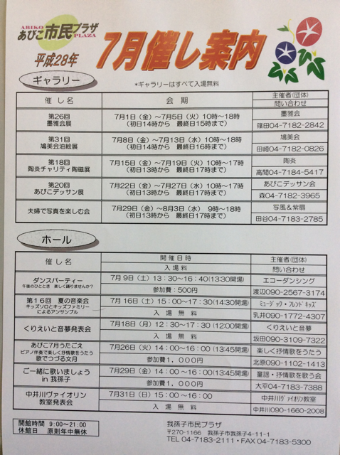 あびこ市民プラザ7月の催し物をご案内いたします。