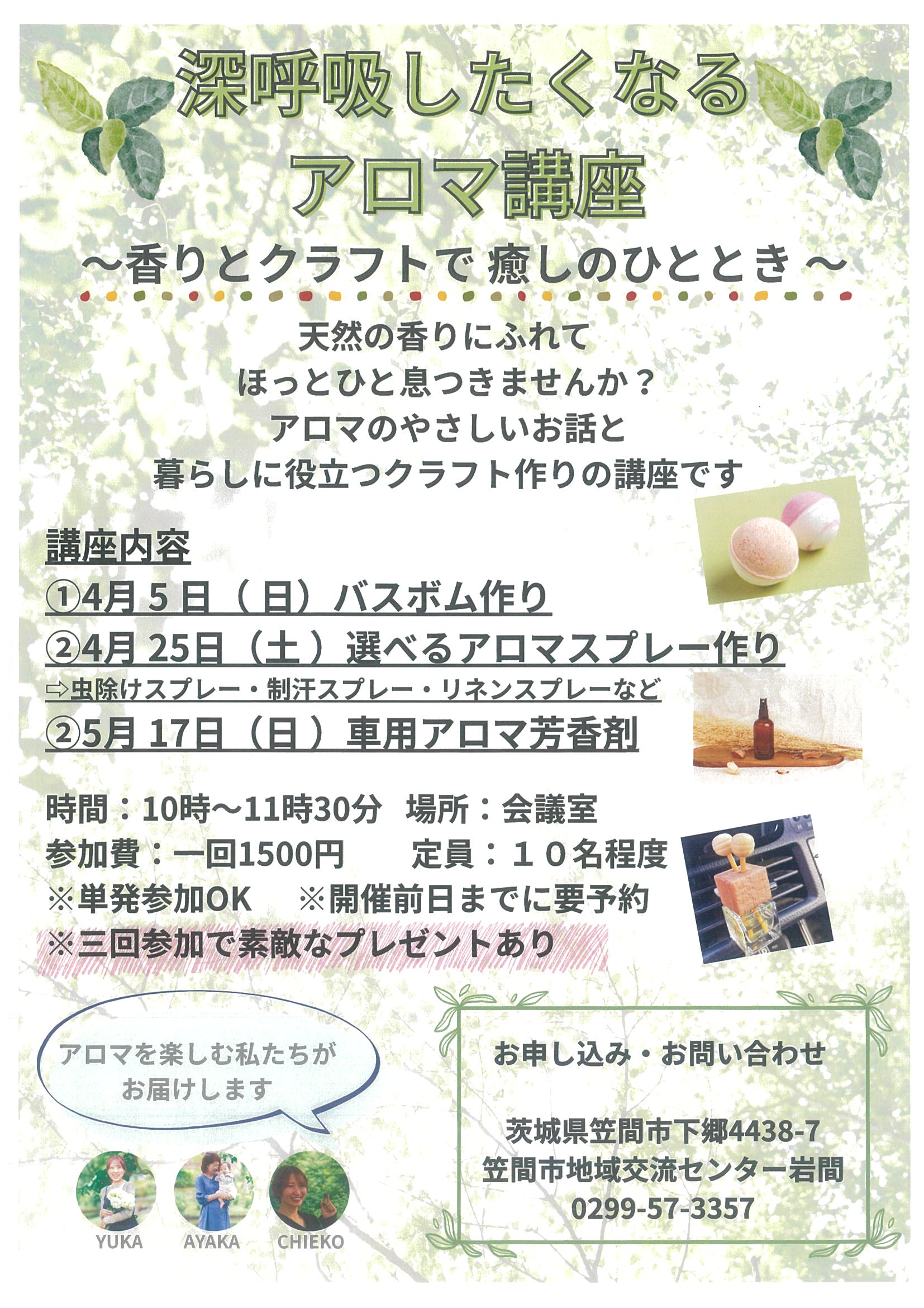 天然の香りにふれて、ほっとひと息つきませんか? アロマのやさしいお話と、暮らしに役立つクラフト作りの講座です♪