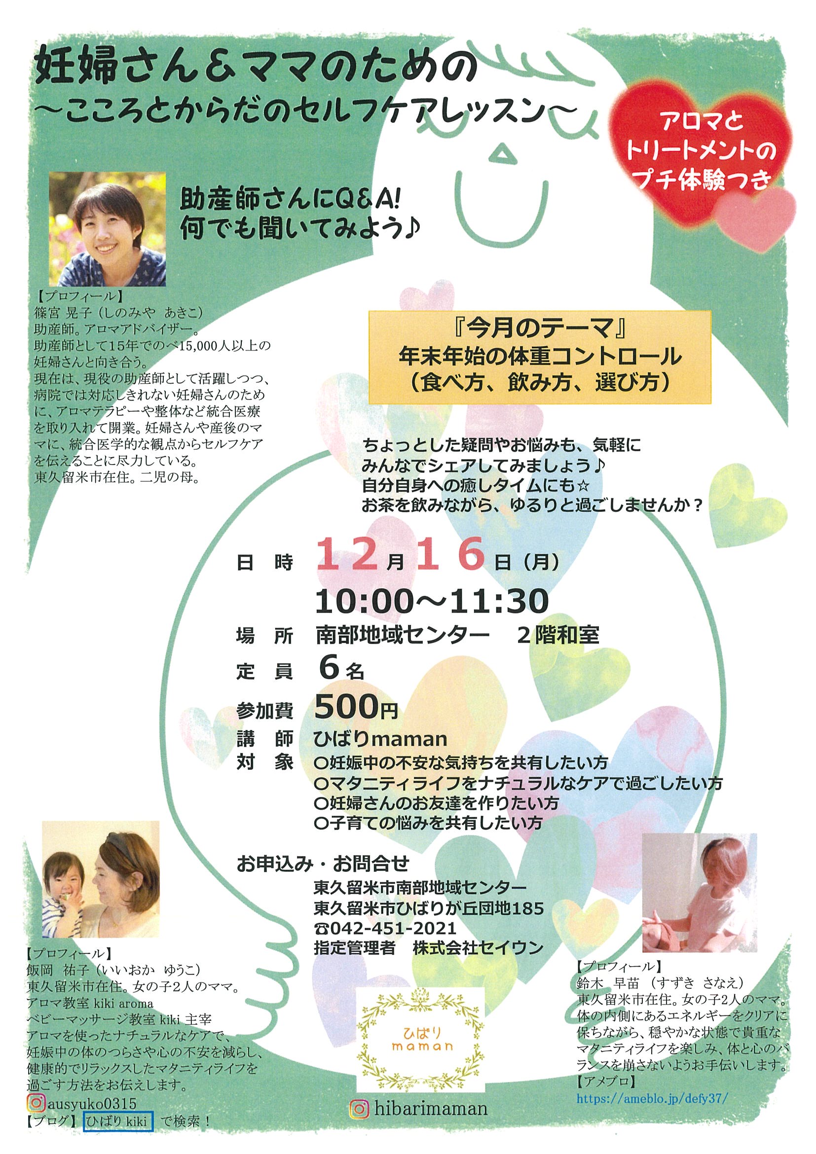 【南部地域センター】12月16日(月)妊婦さん&ママのための〜こころとからだのセルフケアレッスン