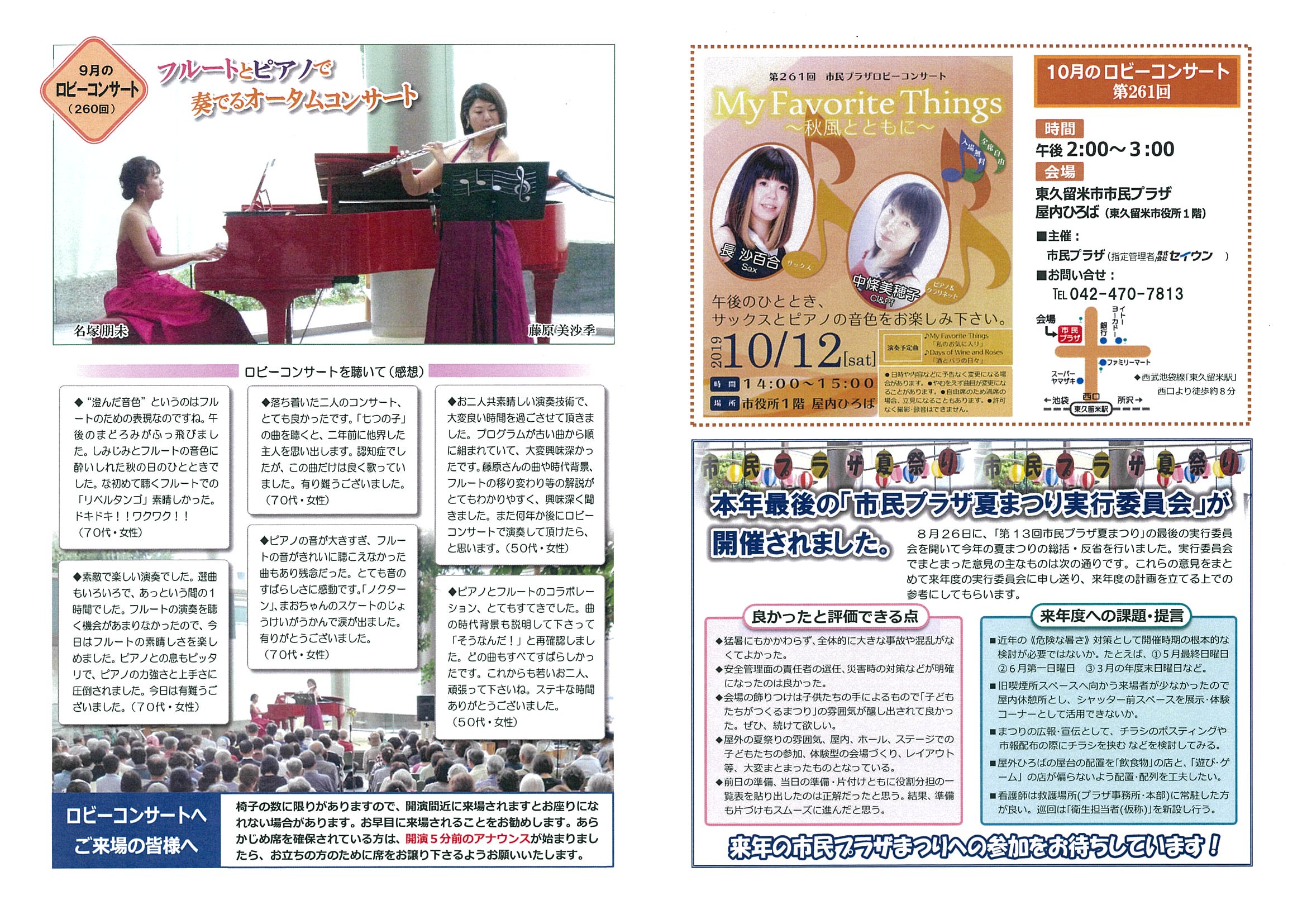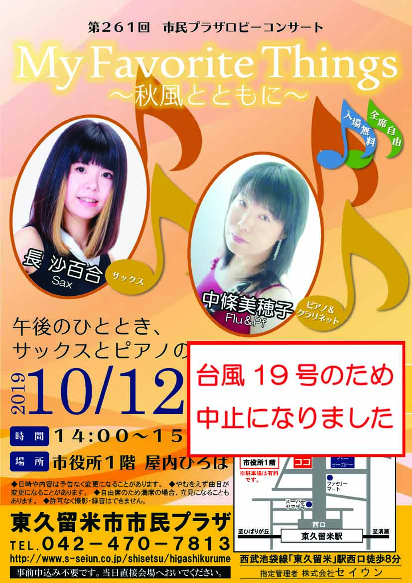 また、同日10/12に予定されておりました市民プラザのロビーコンサートも、併せて中止にいたします。楽しみにされていた方には申し訳ございませんが、次回のロビーコンサートまでお待ちください。