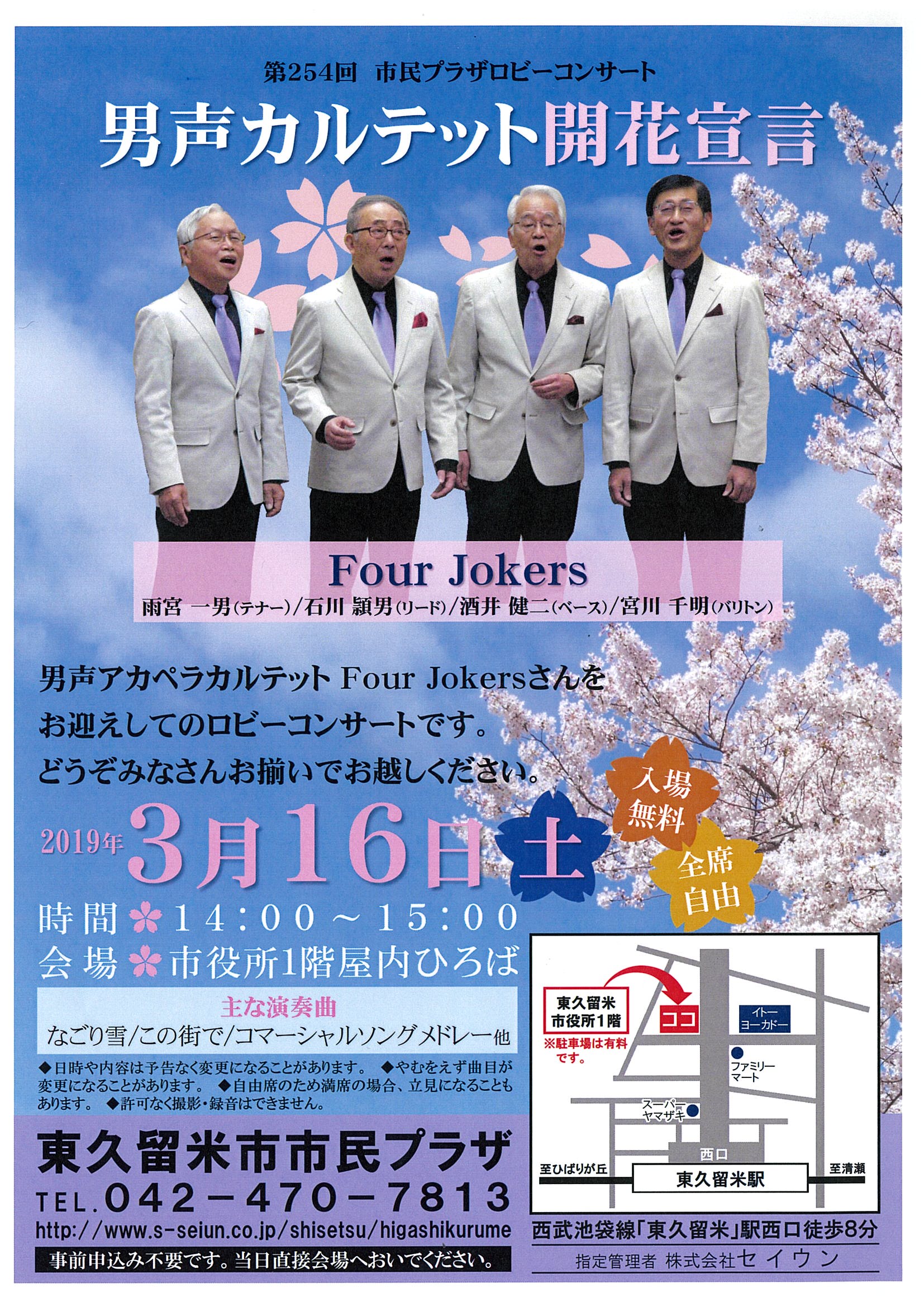 コーラス大好き、冗談好きの4人が集まり、2017年1月カルテットを結成。