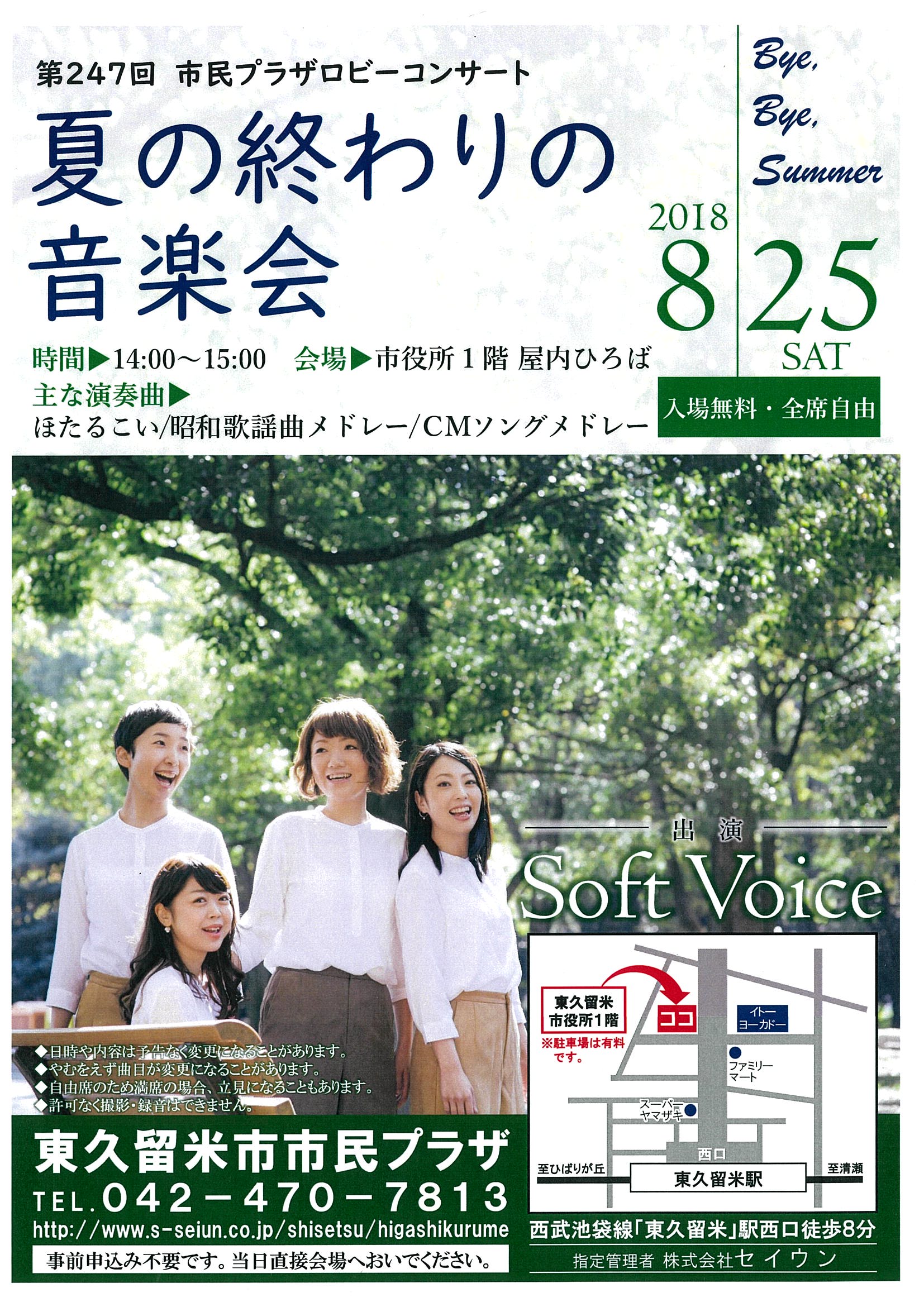 8月の市民プラザロビーコンサートは、Soft Voiceさんのご出演で、夏の終わりの音楽会と題しましてアカペラ・コーラスをお届けいたします。