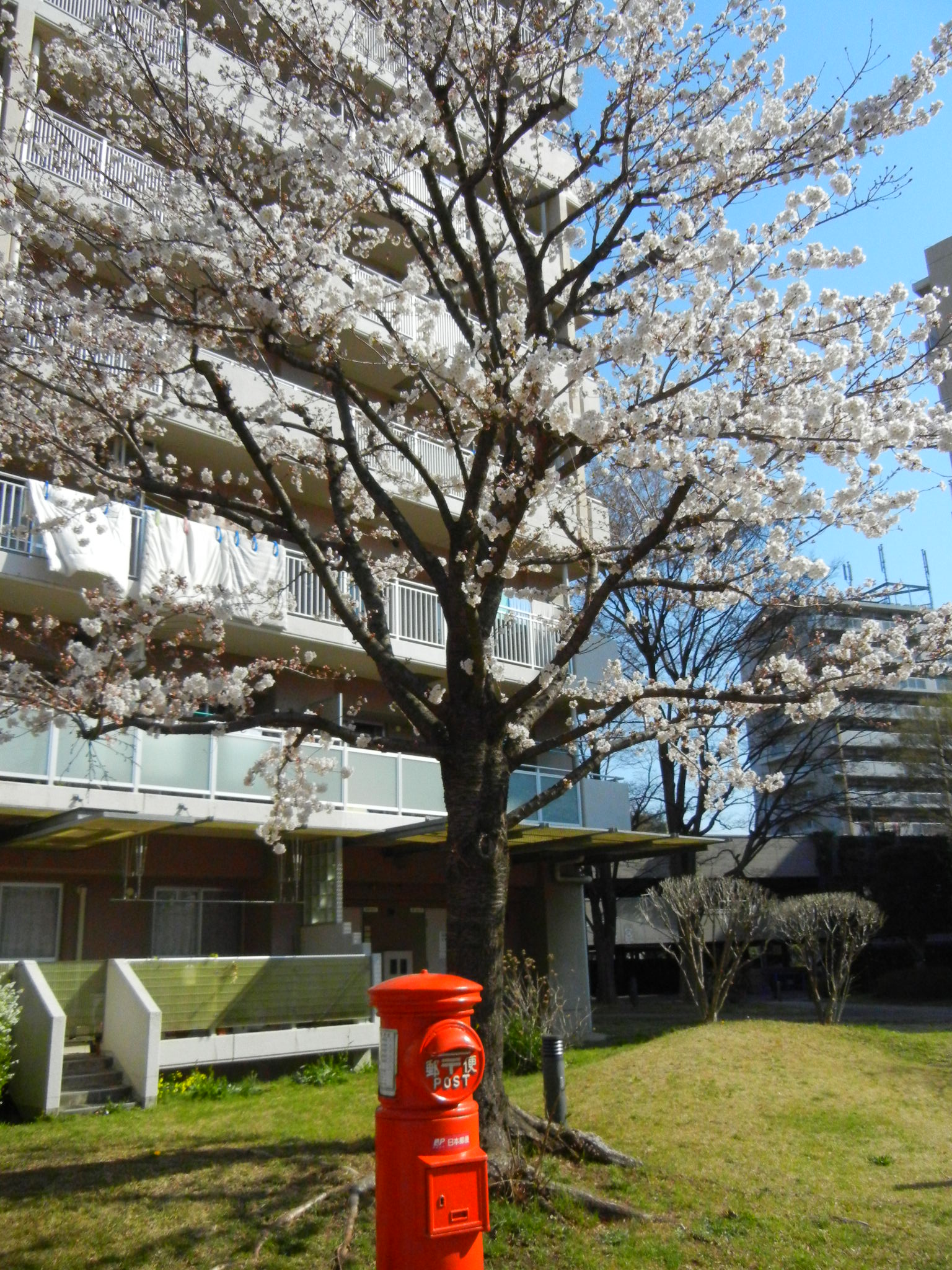 南部地域センター前のマスコット的存在のポストの桜ももうすぐ満開です。(桜の種類は不明なのですが・・・)