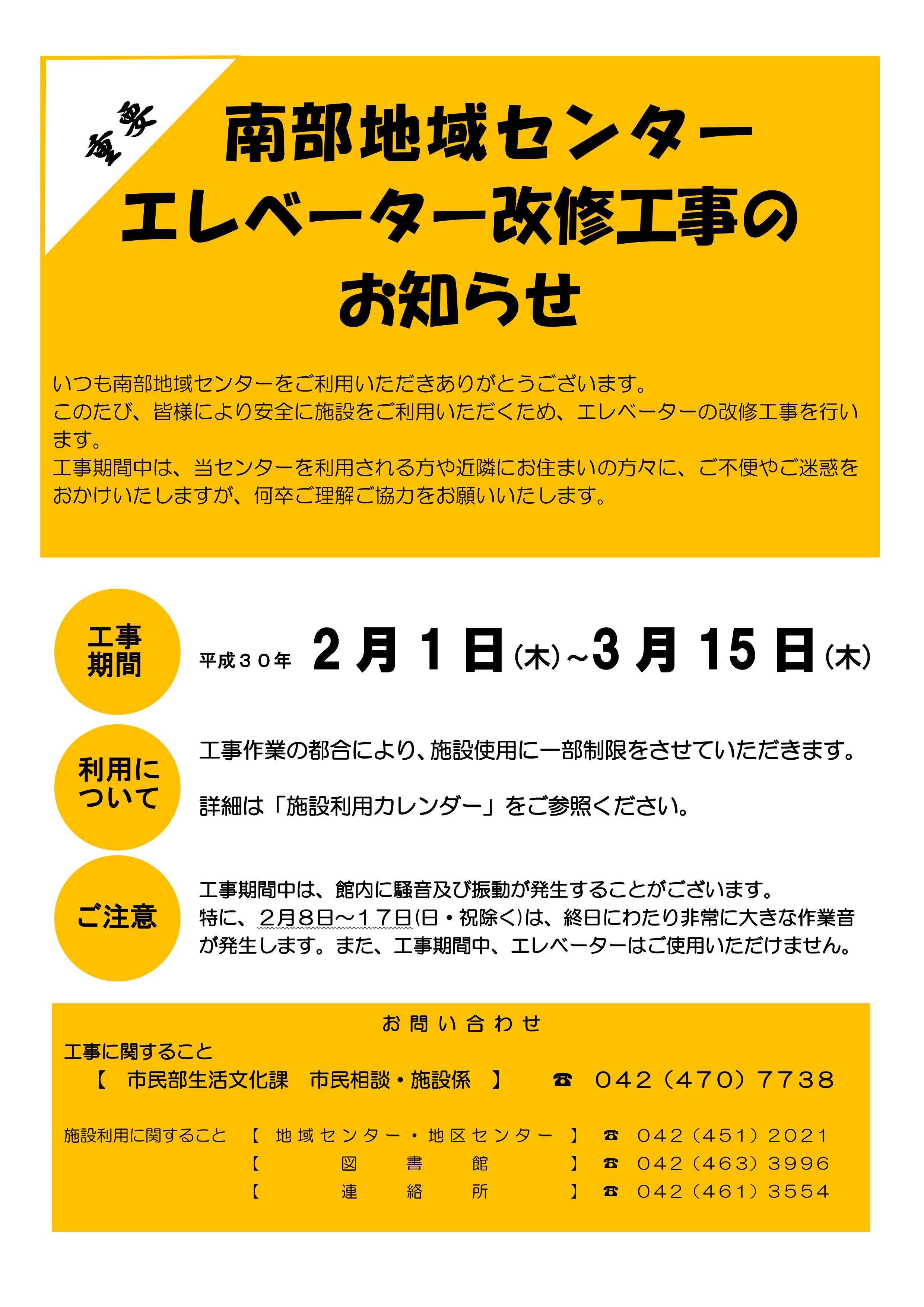 【重要なお知らせ】【南部地域センター】エレベーター工事について