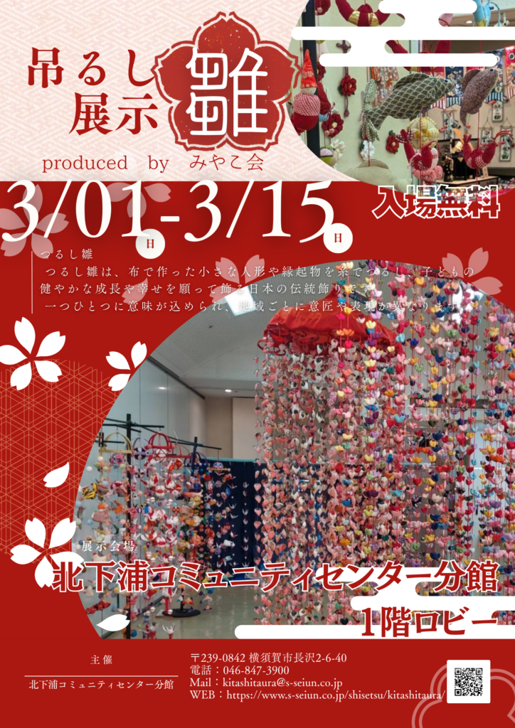 3/1~3/15まで北下浦コミュニティセンター分館では「つるしびな」を展示いたします。