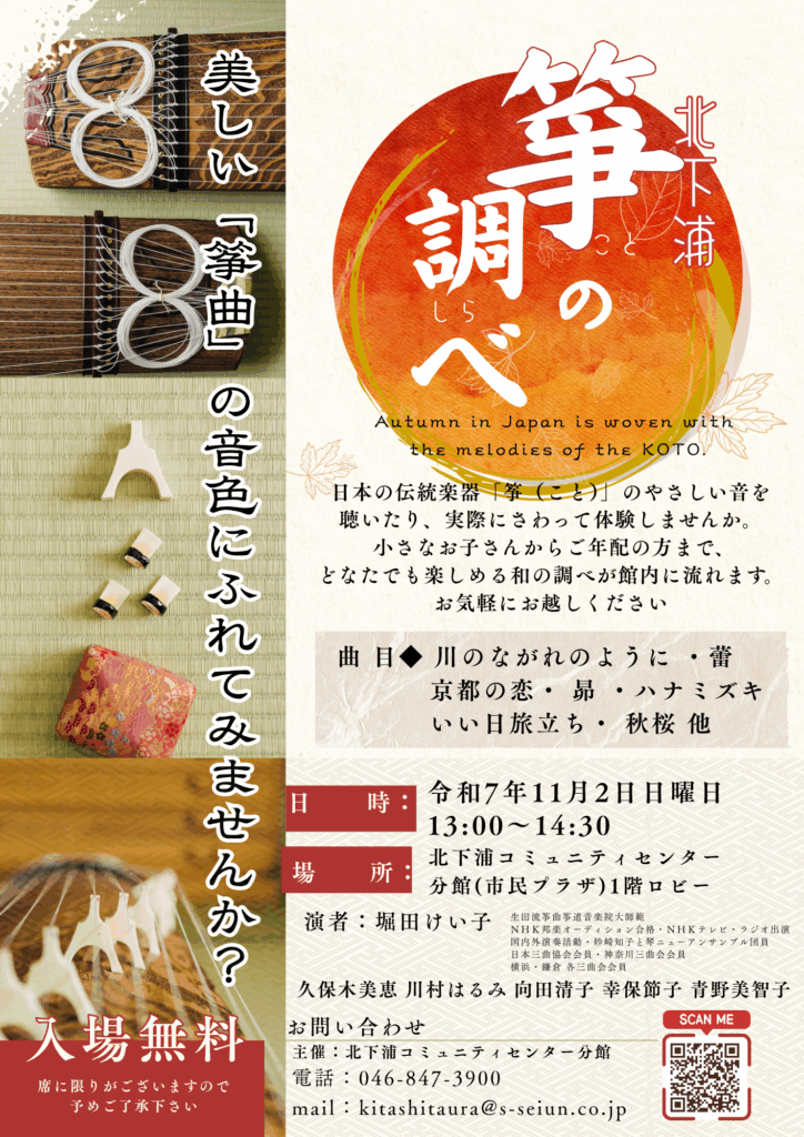 【終了】北下浦 箏の調べ 2025年10月31日 最終更新日時 : 2025年11月3日 yokosuka 美しい「箏曲」の音色にふれてみませんか? 日時:令和7年11月2日(日) 場所:北下浦コミュニティセンター分館 1階ロビー 入場料無料 詳しくはチラシをご覧ください。