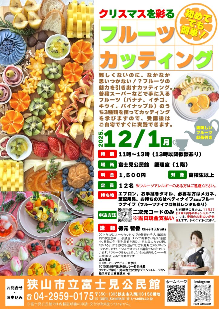 【定員になりました】12/1クリスマスを彩るフルーツカッティング 2025年11月20日 最終更新日時 : 2025年11月20日 fujimi フルーツカッティング教室は、皆様に好評いただき定員となりました。 開催日までにキャンセルが発生し、募集する場合には、改めてご案内いたします。