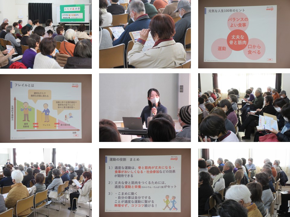年間で最も寒い時期になってきました。今月は健康づくりに役立つ講座です。講師には、株式会社明治より食育担当 管理栄養士の細野さえ子様をお迎えしました。人生100年時代を元気に過ごす為、丈夫な骨と筋肉が必要といった観点から、バランスの良い食事を口から食べる事、運動をする事が大切といわれています。お話は管理栄養士ならではの視点で、BMI(体重Kg÷身長m÷身長m)、口から食べる意義、バランスの良い食事、運動・歩くこと等の講義が続きます。さらに食欲のない時にも食べやすいレシピもいくつかご紹介していただきました。難しい内容を分かりやすく説明してくださり、あっという間に時間が過ぎていきました。参加者からは「バランスに気を付けた食事を心がけます」「健康年齢は重要ですね」「ご紹介のレシピはレパートリーに加えます」などの声が聞かれました。有難う御座いました。