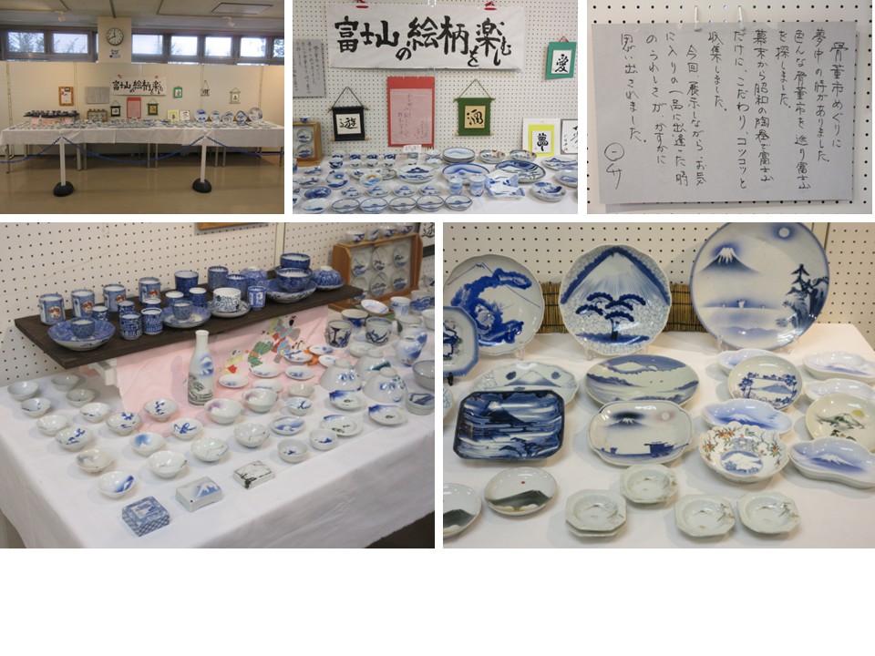 広瀬東にお住いの中山様が、骨董市で集めた陶芸作品を展示しました。富士山が大皿、小皿、湯飲み等に見事に描かれています。展示期間は1/30(金)まで。皆さま是非お越しください。