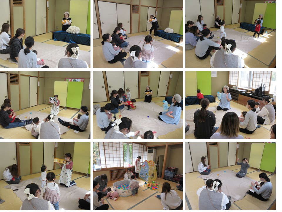 本日、サークルの親子サロンすまいるさんは、ぴーちゃんずの福話術(腹話術)です。海の中のクマノミ、イソギンチャク、ヤドカリ、カメ、クラゲ。リスやオバケ。たくさんの生き物が登場。 イソギンチャクの中に隠れているヤドカリやカメ、クラゲが出て来るのをお子さんが手伝います。何が出て来るのかドキドキ。可愛いヤドカリやクラゲが出て来ると途端に笑顔になりました。親子で、ふにゃふにゃ、ふわふわ、クラゲと一緒にクラゲダンスをしたり、リスやオバケと一緒に鈴やマラカス、カスタネットを持って、演奏会をしたり、お母さんもお子さんも一緒になって楽しんでました。親子あそびで、絵本のキャラクターとにらめっこしたり、パンダやウサギの顔の絵に合わせて、耳の形をまねをします。一瞬でパンダからウサギの顔に変わるとお母さん方から感嘆の声が。お母さん同士、和気あいあいとおしゃべりしながらお子さんと楽しい時間を過ごしていました。
