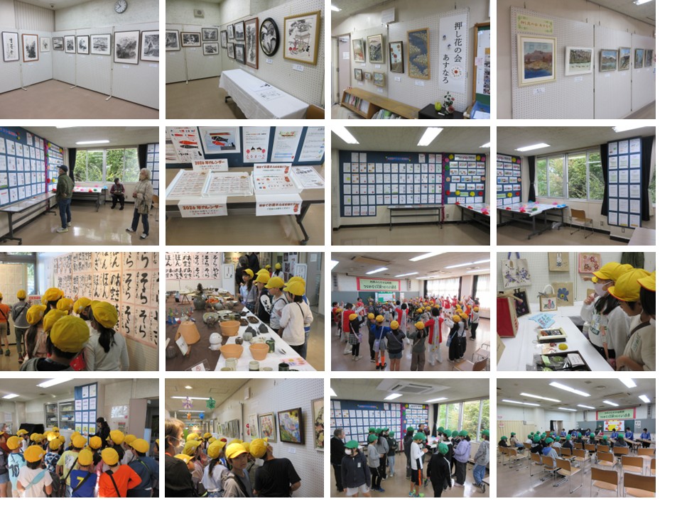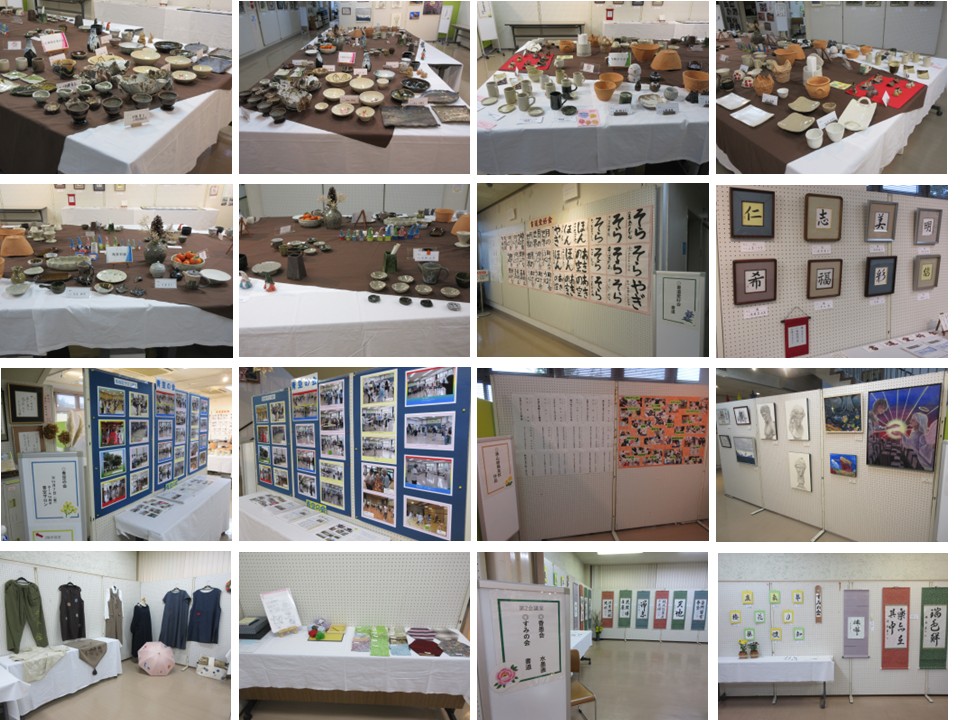 <作品> 陶芸(広瀬陶芸愛好会、作陶ひろせ会、陶芸彩遊)、書道(すみの会、書道愛好会)、水墨画(香墨会)、活動展示(青空の会)、ファブリック・ペイント(ファブリック・ペイントクラブ)、押し花絵(押し花の会あすなろ)、パソコン(広瀬パソコン同好会、広瀬パソコン俱楽部)、美術・俳句・福祉体験の展示(狭山緑陽高校)。
