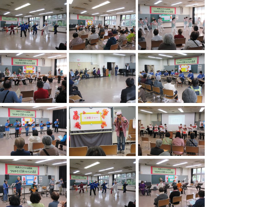 <発表> 気功(つつじの気功教室)、ギター演奏(広瀬ギター同好会)、レクリエーションダンス(レクリエーションダンス同好会・コスモスの会)、ウクレレ演奏(ココハナ、「ウクレレヒロ」)、青空サロン(青空の会)、お琴演奏(筝曲さくらの会)、お話ショー(面白屋お話たんぽぽ)、コーラス(うた声さりね)、演奏(アンサンブルムジーカ)、太極拳(広瀬太極拳クラブ)、二胡演奏(二胡の音色を楽しむ会)。