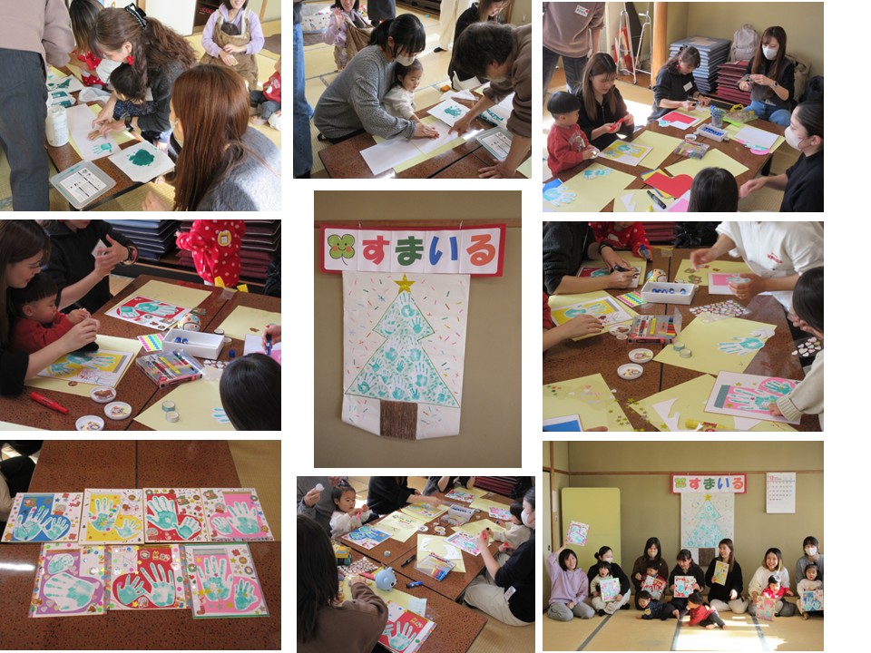 本日の親子サロンすまいるは、手形アートです。お子さんとお母さんで手形を取ります。初めての体験で手にインクをつけたので、ビックリして泣き出してしまうお子さんもいました。色紙にカラフルなブーツ型の紙と手形を貼ったら、回りをデコレーションしていきます。カラフルペンで、模様を描いたり、マスキングテープやシールを貼ったり、お子さんと一緒に思い思いにデコレーションします。皆さん、和気あいあいと楽しんで制作されてました。世界に一つの素敵で可愛いクリスマス手形アートが出来ました。手形を貼ったクリスマスツリーも作成しました。お子さんの手形は、記念になりますし良い思い出となる事でしょう。お母さん方も新しいママ友が出来て、楽しくおしゃべりして過ごしていました。手形で作ったクリスマスツリーは、広瀬公民館ロビーに展示してありますので、ぜひご覧ください。メリークリスマス!