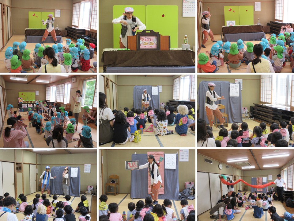 夏の暑さが和らぎ、本格的な秋の訪れを感じる美しい季節です。本日は広瀬保育所の園児さんを迎えて面白屋お話たんぽぽ様にご協力いただき、『おはなしショー』の始まりです。1部(2才~3才)では「おいしい おかお!」梅干しのおにぎりの絵が出て来ました。みんなすっぱい顔に。次は何かな?あっ!みんなの好きなアイスクリームの絵です。みんなの顔がおいしい おかおになりました。「いない いない  ばあ」の“ばあ”はニッコリと。みんな素敵な笑顔です。2部(4才~5才)では「くらげとさる」のお芝居。さる役で園長先生が飛び入り参加するとみんな大喜び!絵本の読み聞かせ「いぐいぐいぐいぐ」では、“いぐいぐいぐいぐ ごじゃらばごじゃれ”と呪文を唱えると、三つ目の首がどんどん伸びていきます。みんなも一緒に呪文唱えると何処からか首の長~い三つ目が出て来ました。みんなの上をぐるぐる回っています。大きな声で“いぐいぐ…”“ごじゃらば…”呪文を繰り返します。三つ目は何処かに行ってしまいました。あっという間に楽しい時間が過ぎてしまいました。みんな笑顔で口々に「ありがとう」「おもしろかった」「楽しかった」「ごじゃらば…」。楽しい思い出がまた一つ出来たことでしょう。ありがとうございました。