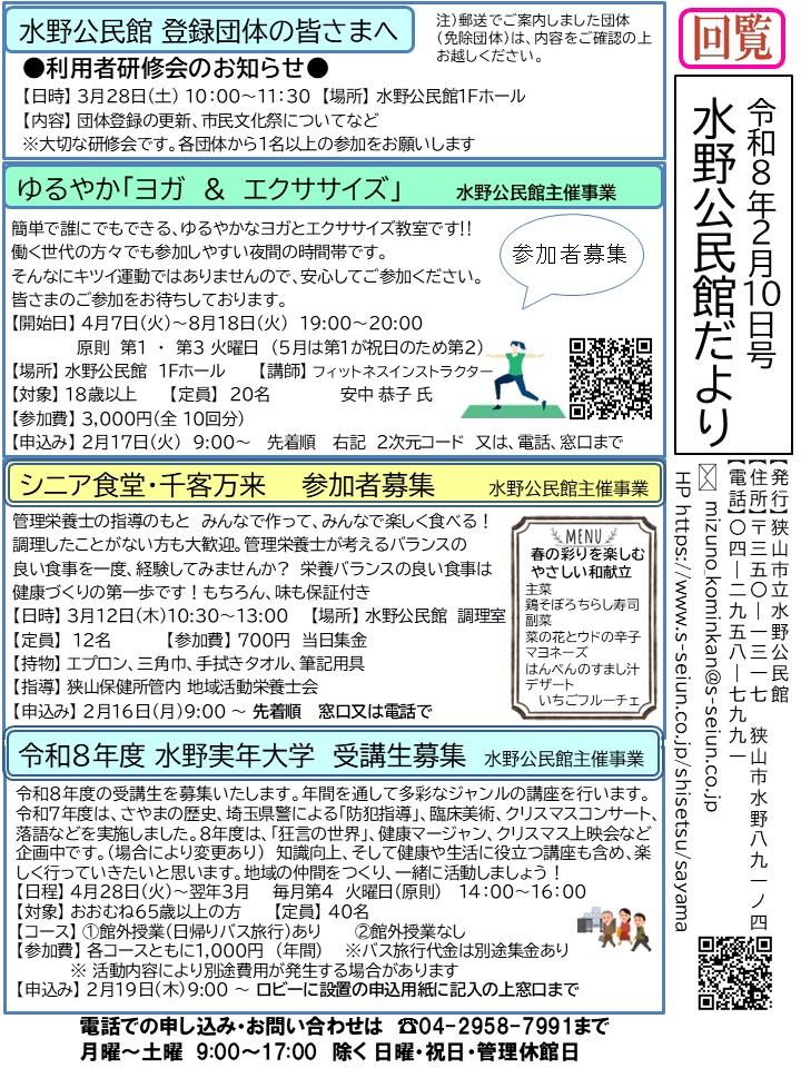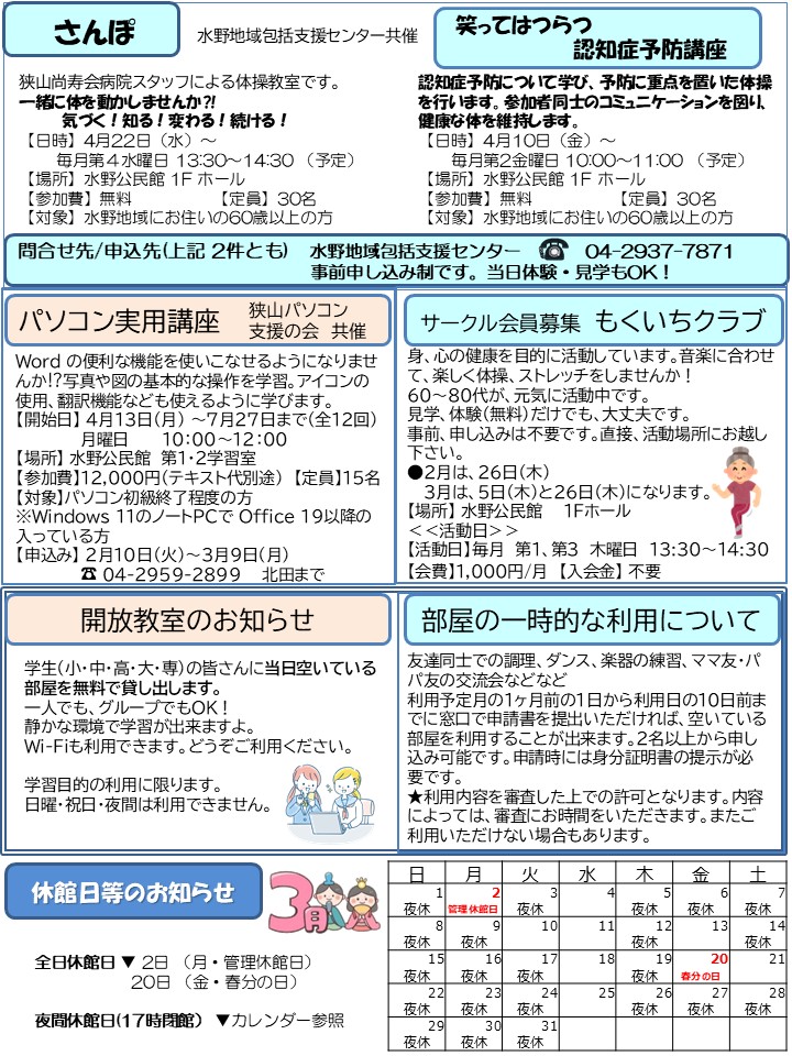 埼玉県狭山市水野にある公民館。水野の森の北に位置し、自然に恵まれた環境の中で地域の方々の憩いの場にもなっています。