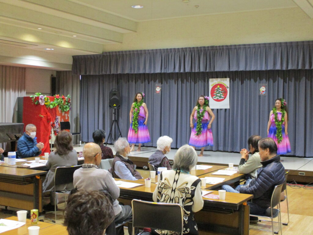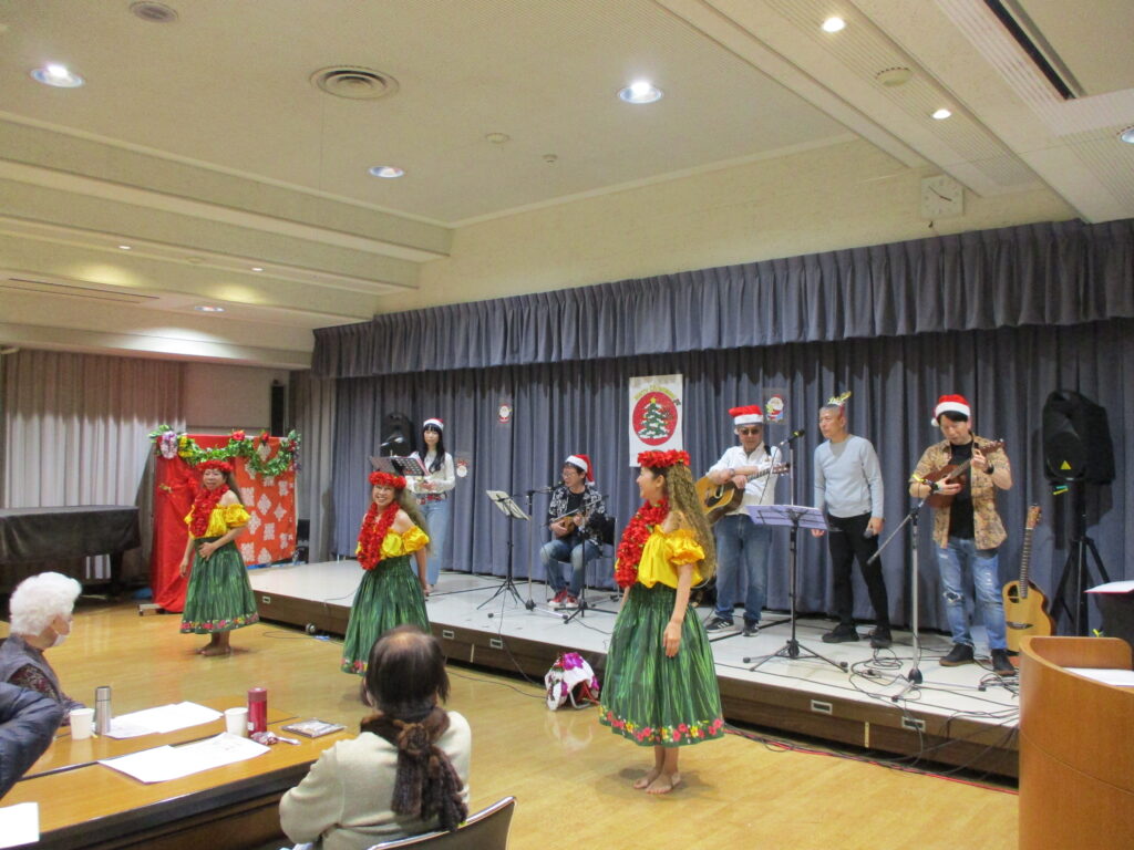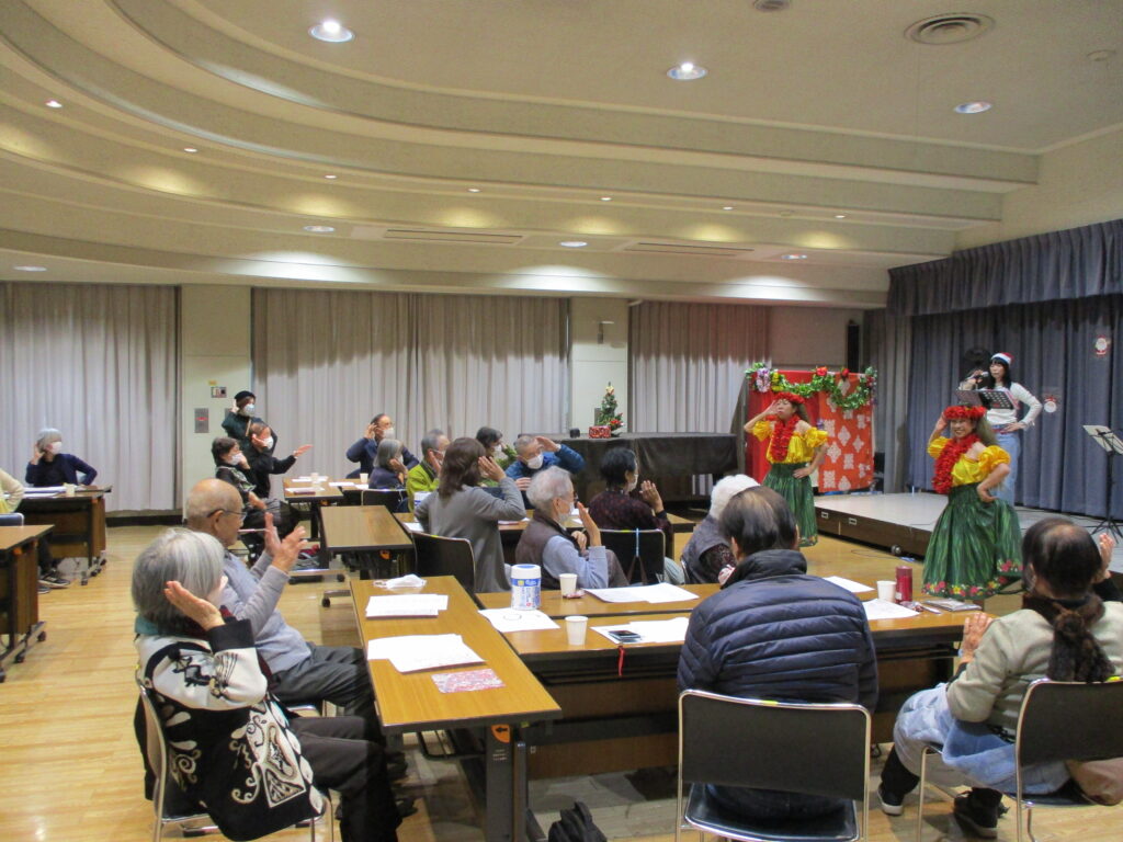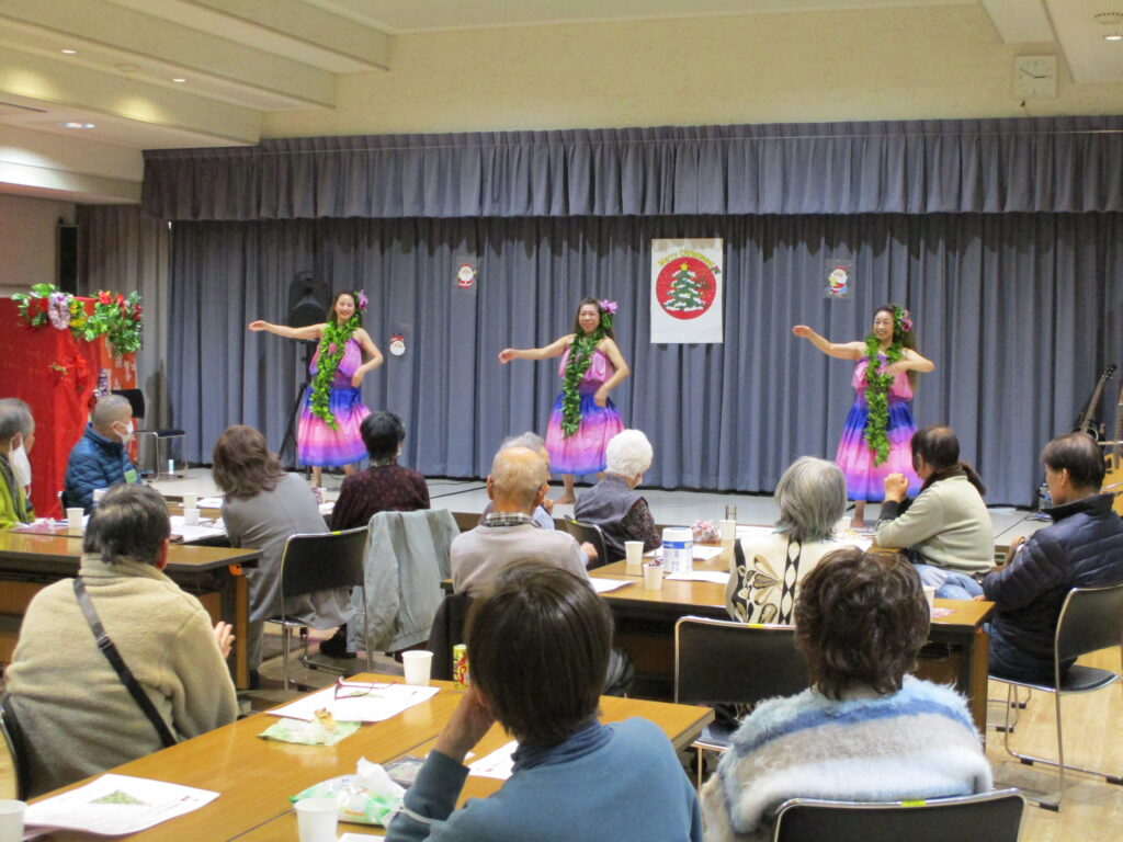 12月は毎年人気のある「クリスマス会」。ケーキとコーヒー等を頂きながら音楽を聴いたり、フラを鑑賞したりと盛り上がった