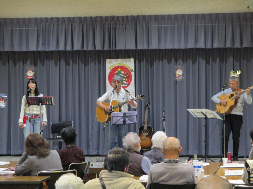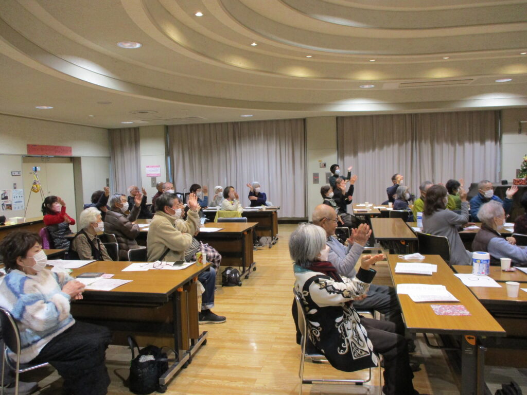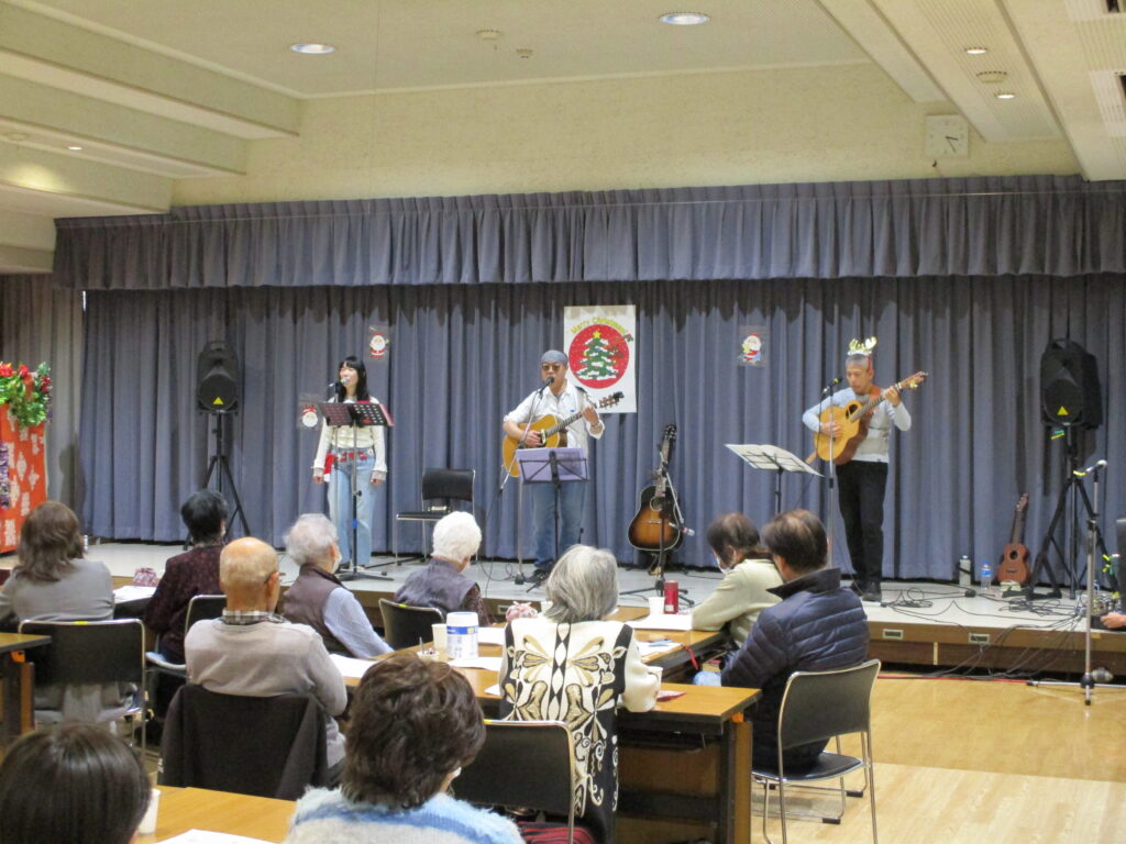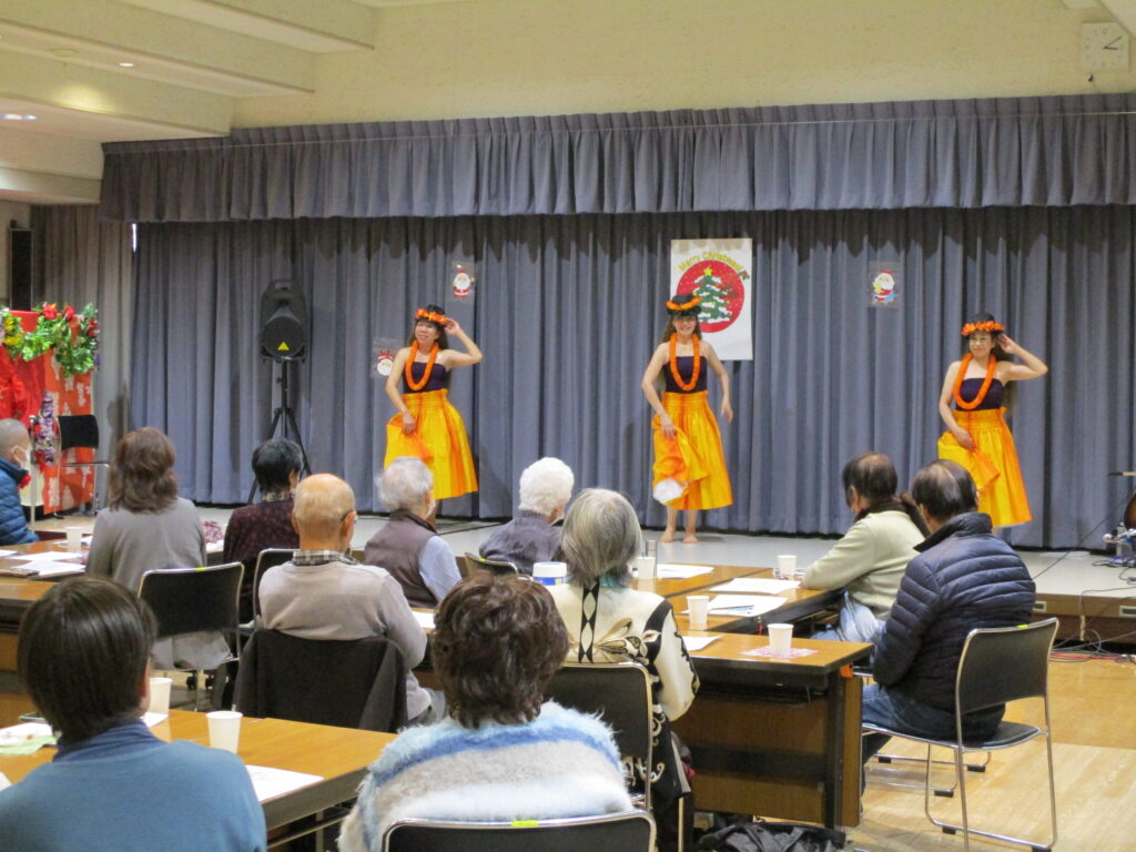 12月は毎年人気のある「クリスマス会」。ケーキとコーヒー等を頂きながら音楽を聴いたり、フラを鑑賞したりと盛り上がった