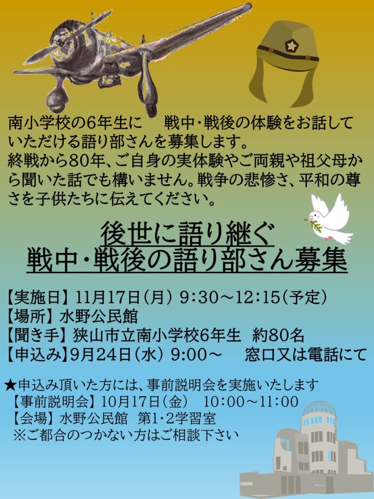 水野公民館では、南小学校の6年生に戦中・戦後の体験をお話していただける「語り部さん」を募集します。