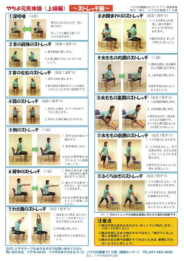 「やちよ元気体操」は、日頃あまり運動をしていないという方でも、大変取り組み易く効果の高い体操です。是非できるところだけでもチャレンジしてみて下さい。