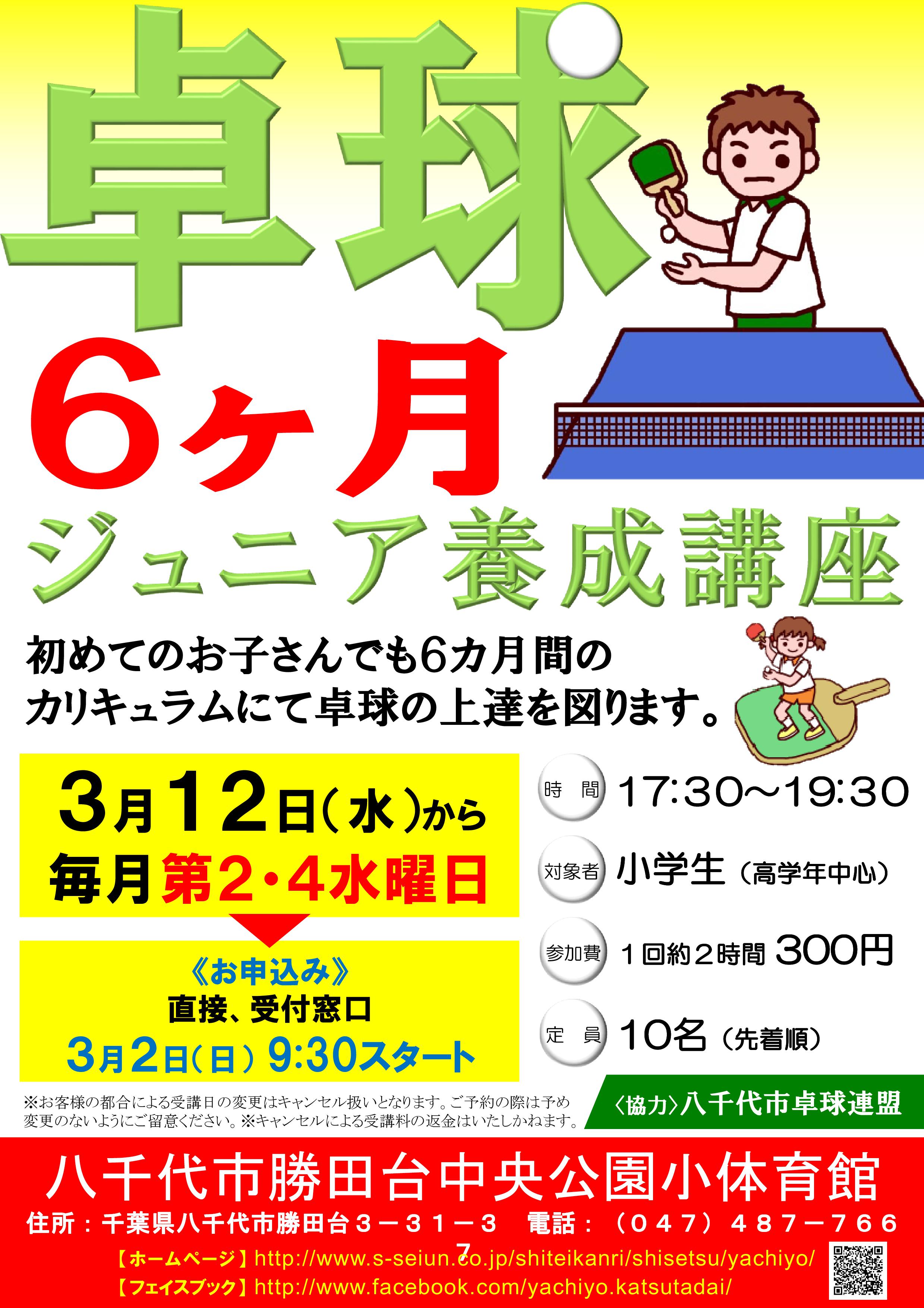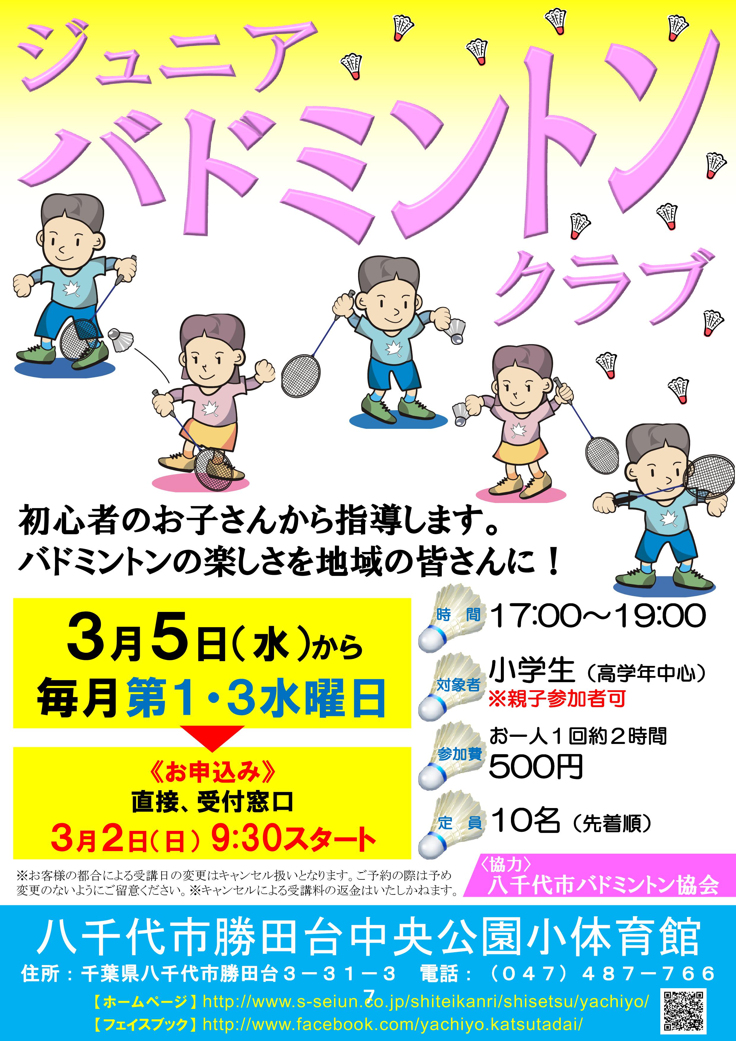 3月より第1・第3水曜日ならびに第2・第4水曜日に小学生高学年を対象とした「ジュニアバドミントンクラブ」、「卓球6ヶ月ジュニア養成講座」をそれぞれ開講いたします。成長期のお子様の健全な心身の育成にお役立て下さい。