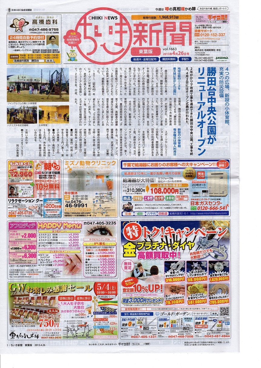 地元ネタ中心に役に立つ情報地元紙の「ちいき新聞」4月26日号のトップに中央公園と合わせて我が「勝田台中央公園小体育館」も紹介の掲載!
