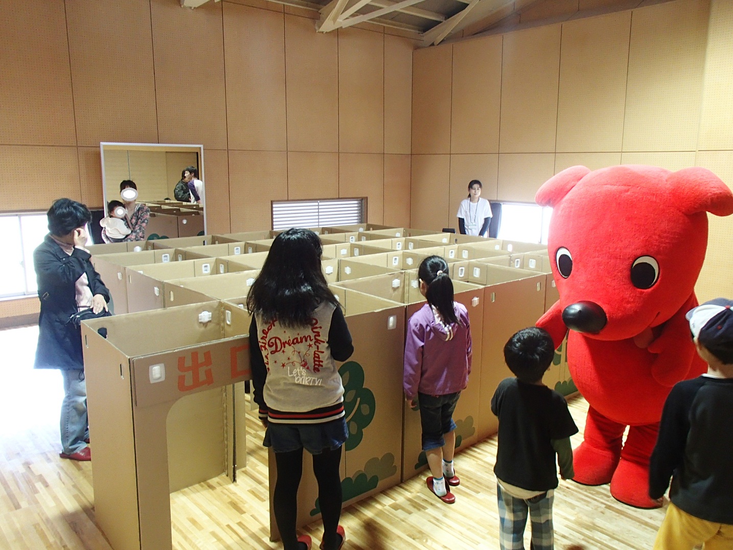 第2小体育室では段ボール迷路(お一人1回200円でチーバ君との記念写真プレゼント)は多くのちびっこ達に大好評。